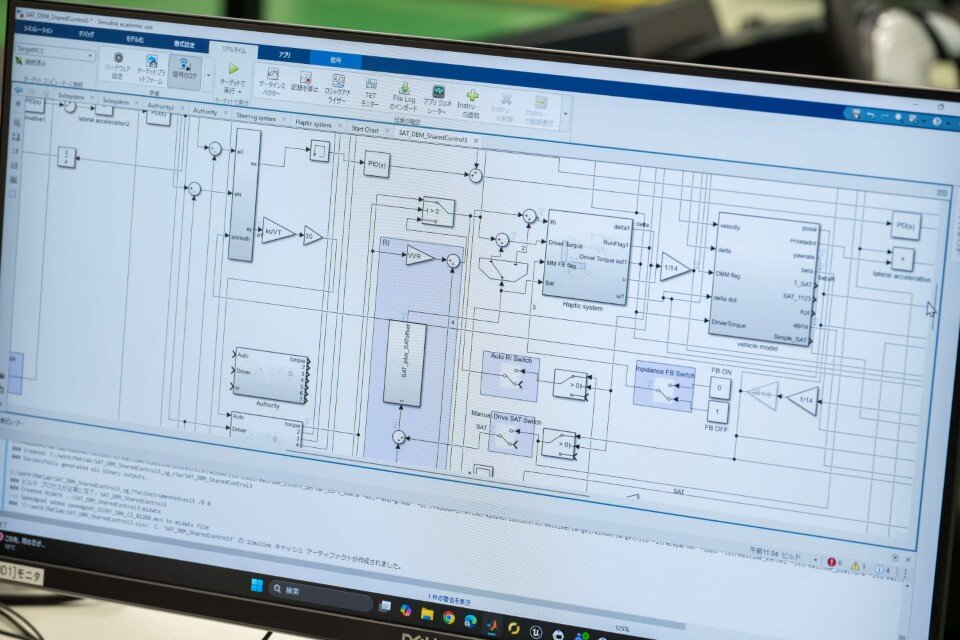 具体的には、反力モータを用いて人工的に反力(手応え)を生み出し、クルマの状態を伝える自動運転システムとドライバーのシェアードコントロールの研究を行っています。システムを構築する上では、MBD(Model Based Design)を活用しています。MBDとは、コンピュータ上でシミュレーション可能な「モデル」を作成し、そのモデルを中心に設計・検証を進める開発手法です。従来の設計手法と違い、実機検証までにモデルによる検証を進めることができ、品質向上と工程・コスト削減を同時に達成できる手法です。こうした実践的な手法を採り入れる研究が、地元産業界から高く評価されているのです。