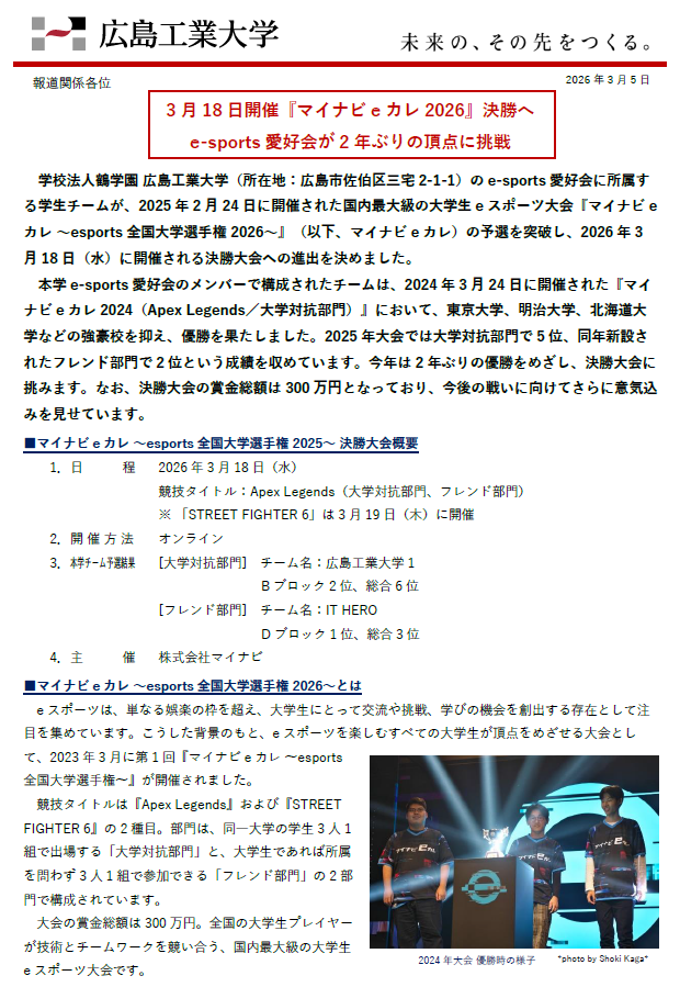 【プレスリリース】e-sports愛好会が2年ぶり2度目の優勝 『マイナビeカレ2026』で国内頂点に