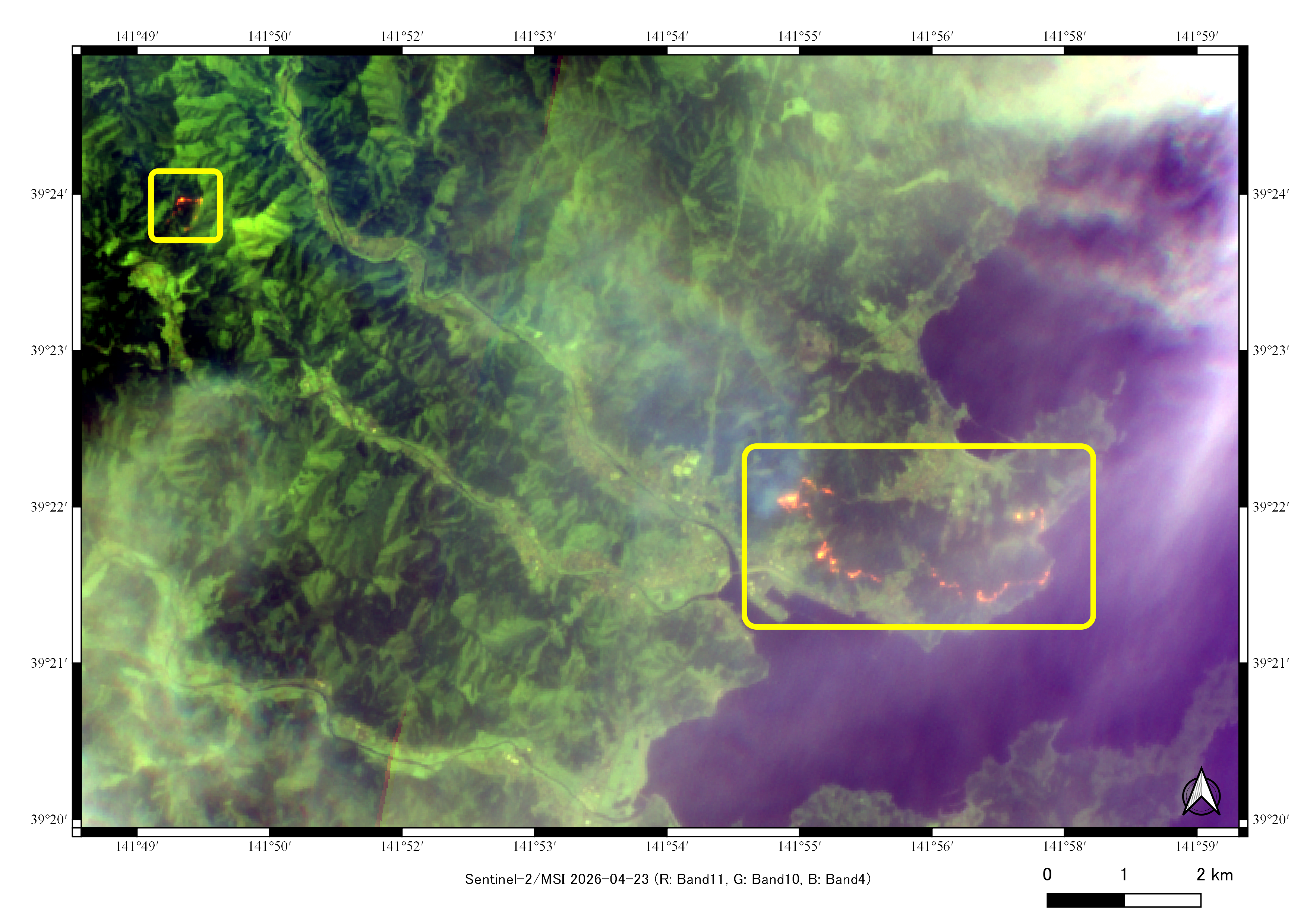 【図2】(4月23日観測)は、火災発生後の状況を示しています。当時は雲がかかっており視認性は低いものの、画像東部の半島および北西部の山間部において、激しい火災(樹冠火)を示唆する橙色の輝点が確認されます。