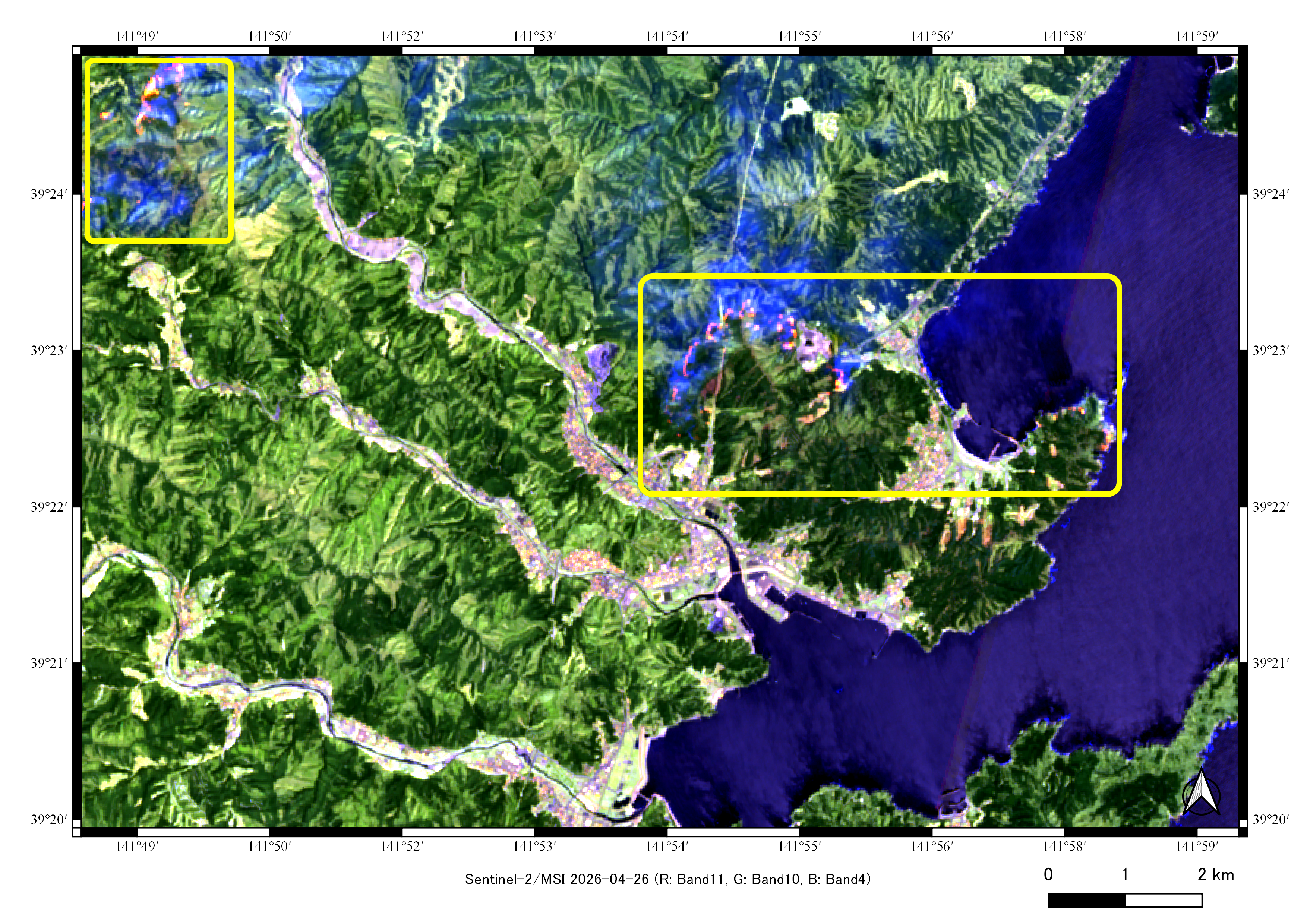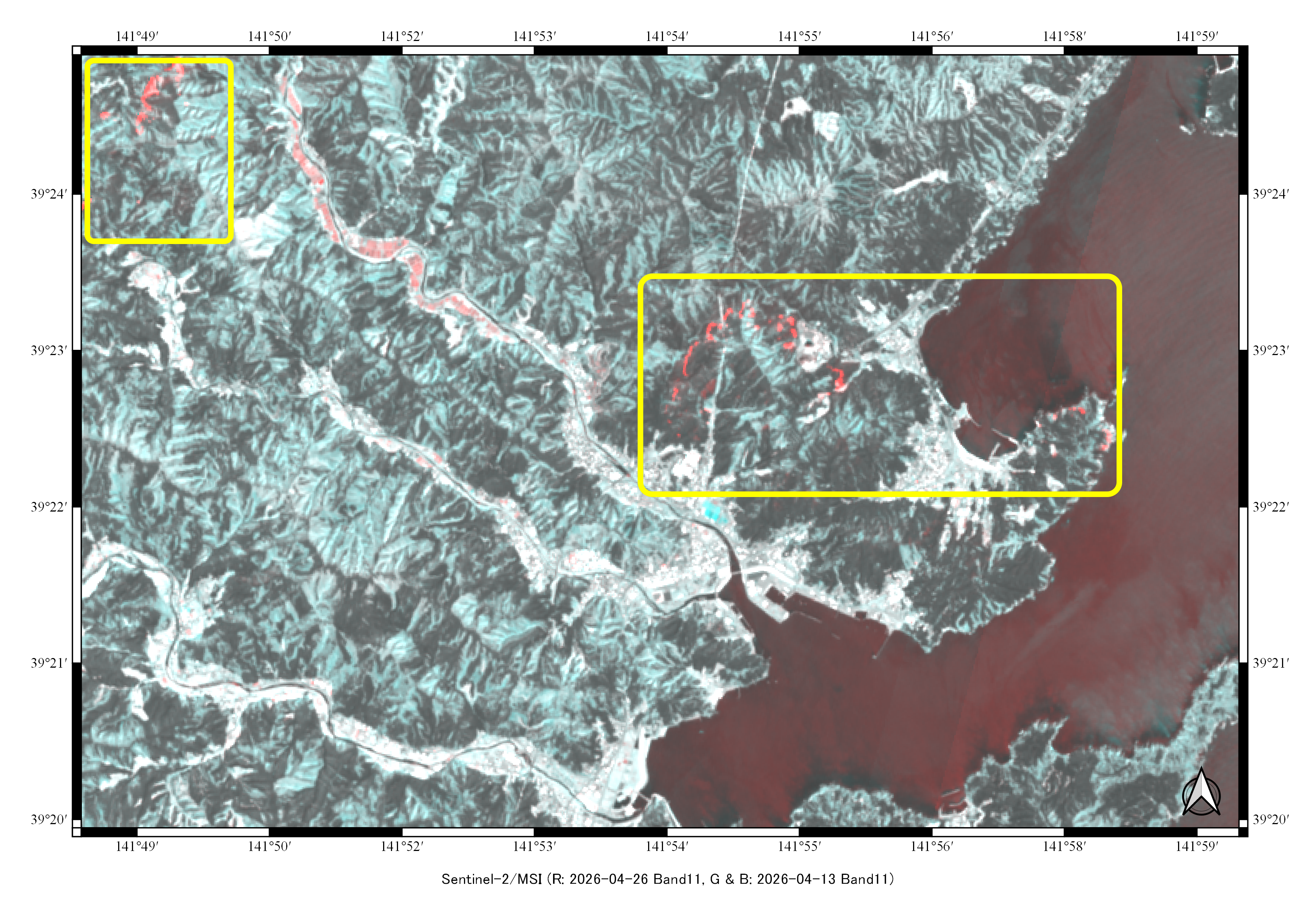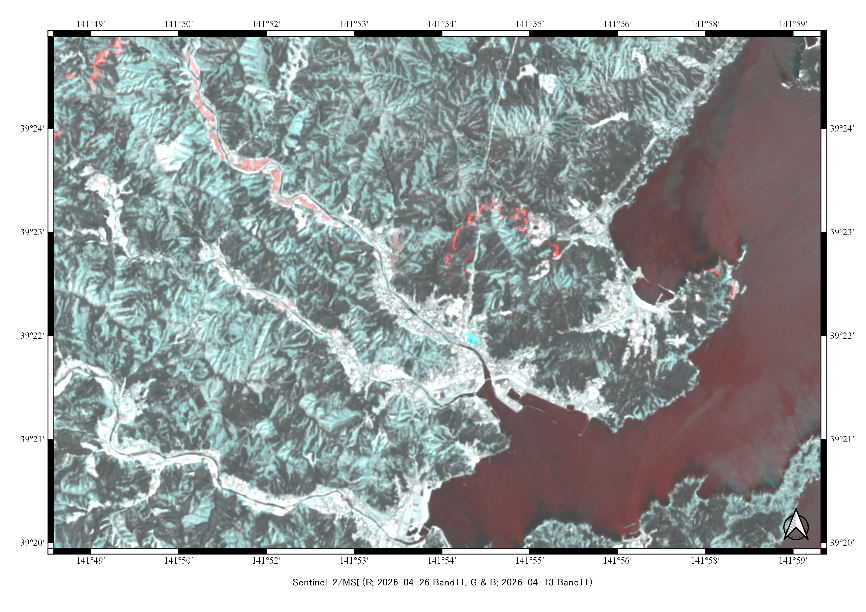 【図4】Sentinel-2バンド11カラー合成画像(2026年4月13日、4月26日観測) |