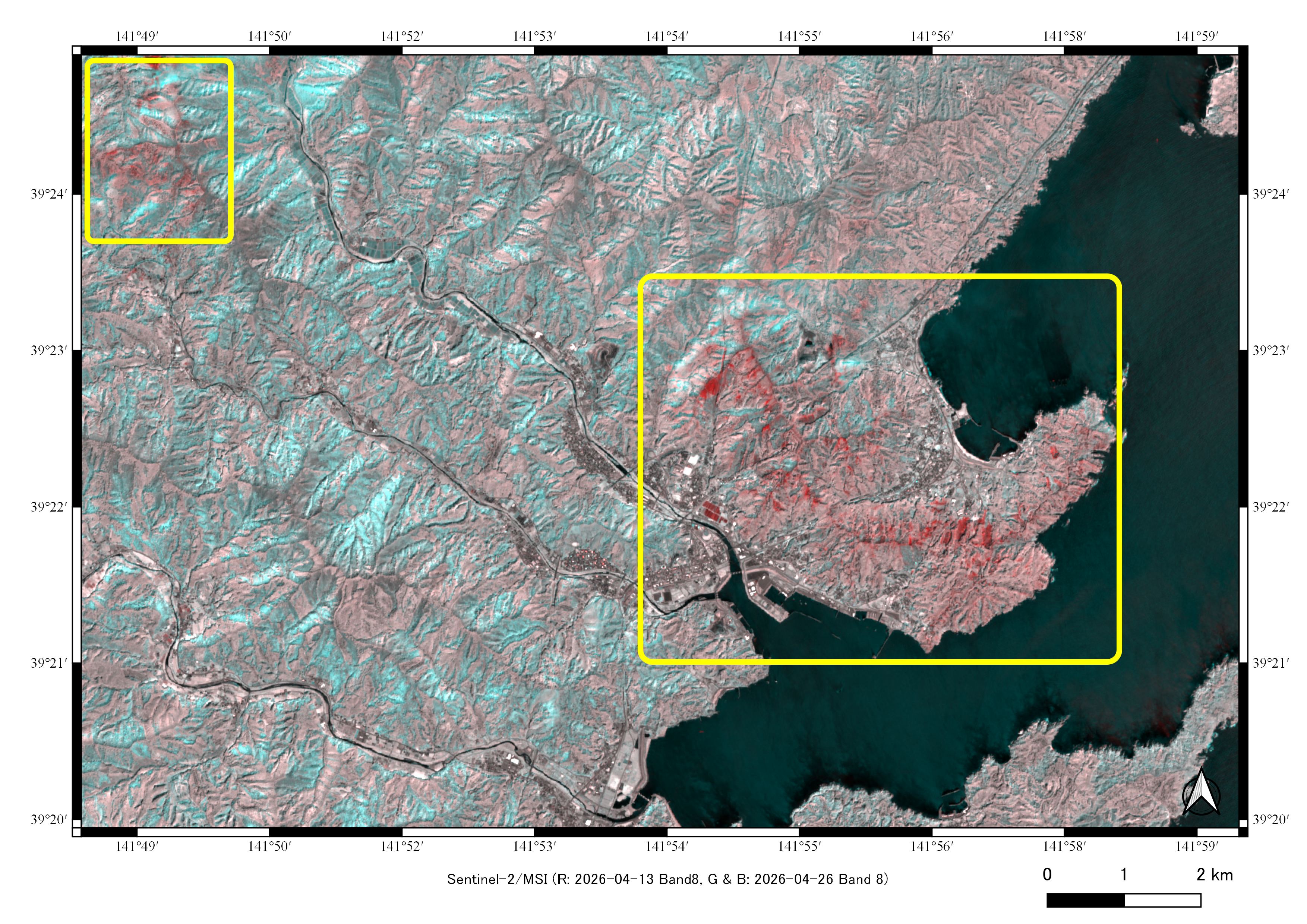 【図5】Sentinel-2バンド8カラー合成画像(2026年4月13日、4月26日観測) |