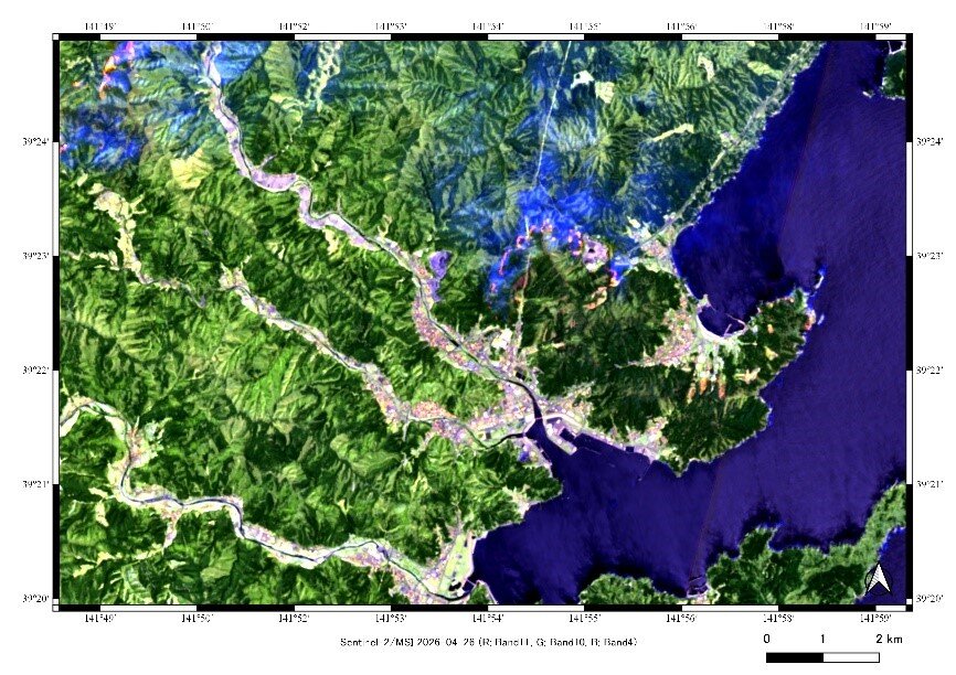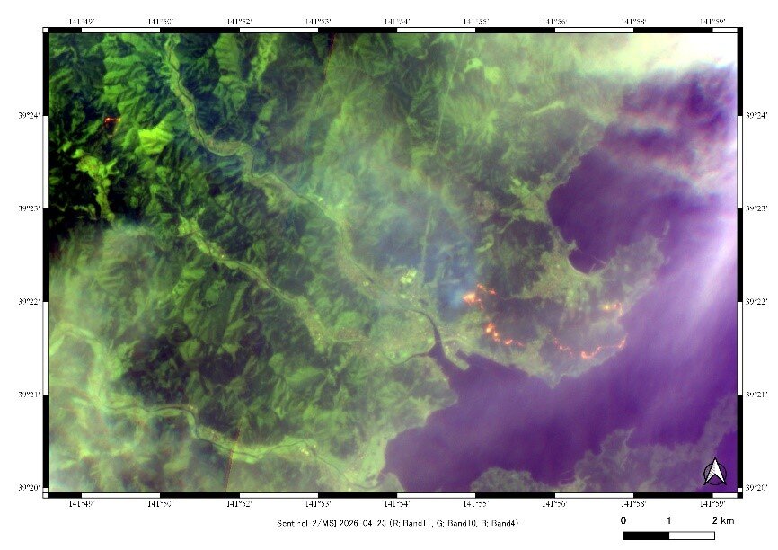 2026年4月22日に岩手県上閉伊郡大槌町で発生した林野火災を受け、欧州の地球観測衛星Sentinel-2A/Bによる観測画像を解析しました。本解析では、空間分解能10mの可視光および近赤外(NIR)データ、ならびに20mの短波長赤外(SWIR)データを用いて、火災域の検出を試みました。