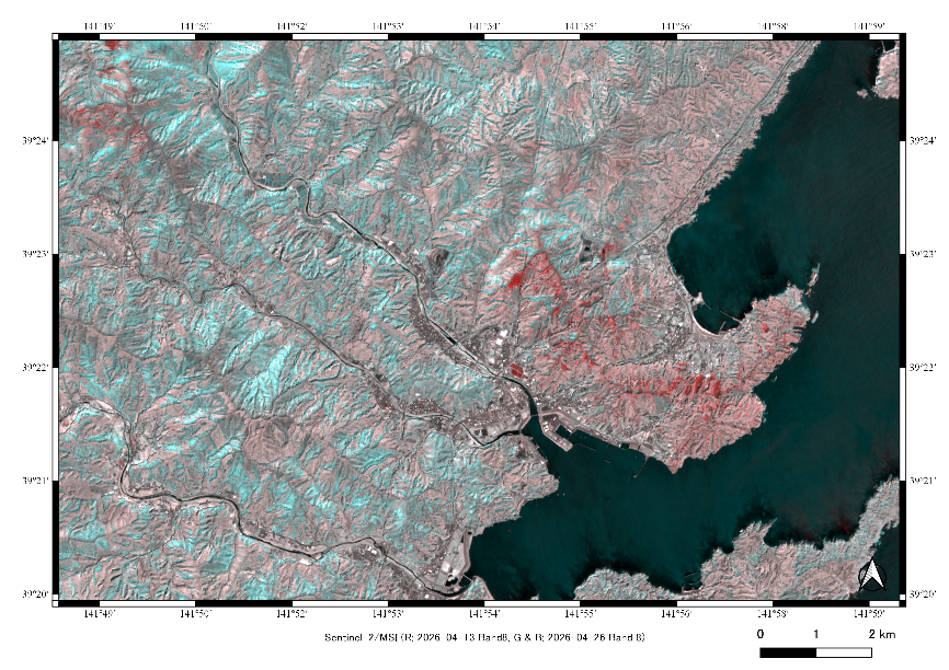 【図3】Sentinel-2フォールスカラー画像(2026年4月26日観測) |