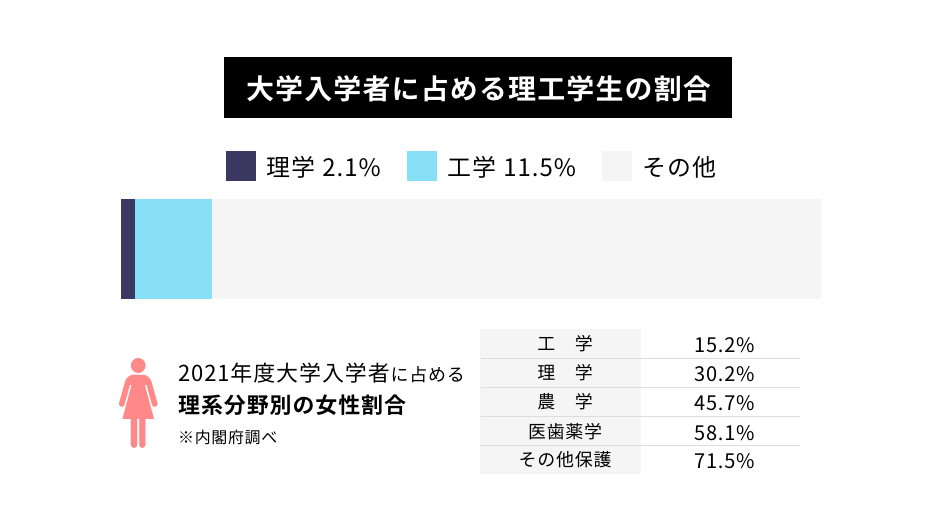 現在、理工系分野で活躍している女性はどれくらいいるのでしょうか?文部科学省が公表している「令和3年度学校基本調査」によると、2021年の大学入学者に占める理工系分野入学者の割合は、理学が2.1%、工学が11.5%となっています。そしてその中の女性比率は、理学が30.2%、工学が15.2%。これは世界各国と比較してもかなり低い数値となっており、日本国内では理工系分野を目指す女性の割合はまだまだ少ないことが分かります。
